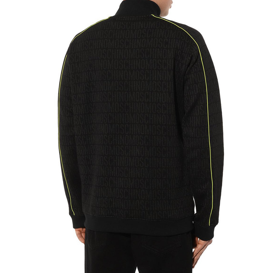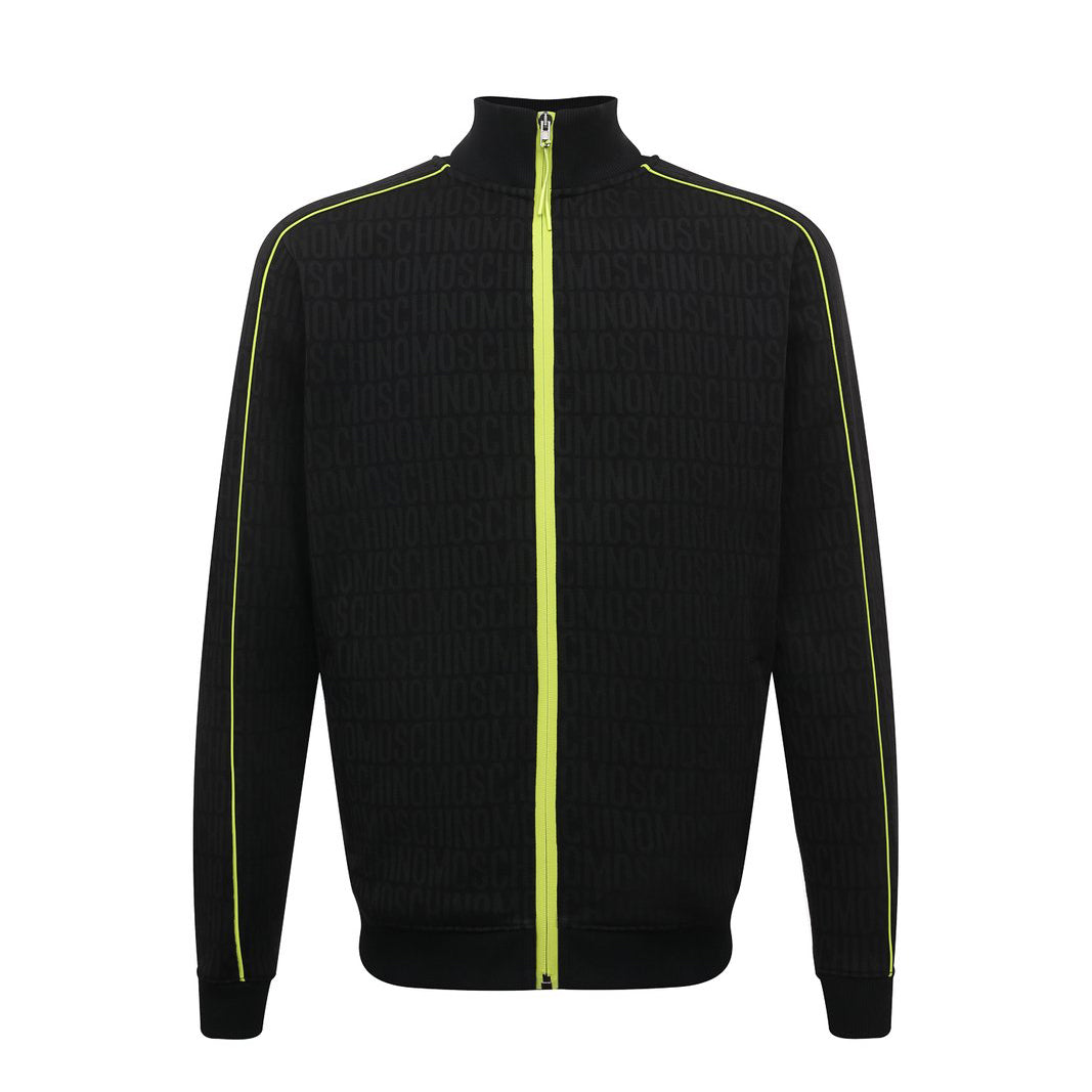 monogram-print zipped track jacket from MOSCHINO featuring , black, green,cotton blend, monogram pattern, high neck, front zip fastening, long sleeves, two side slit pockets, elasticated cuffs and elasticated hem.