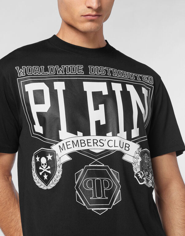 - Details: "PLEIN MEMBERS CLUB" graphic; emblem prints; round neck