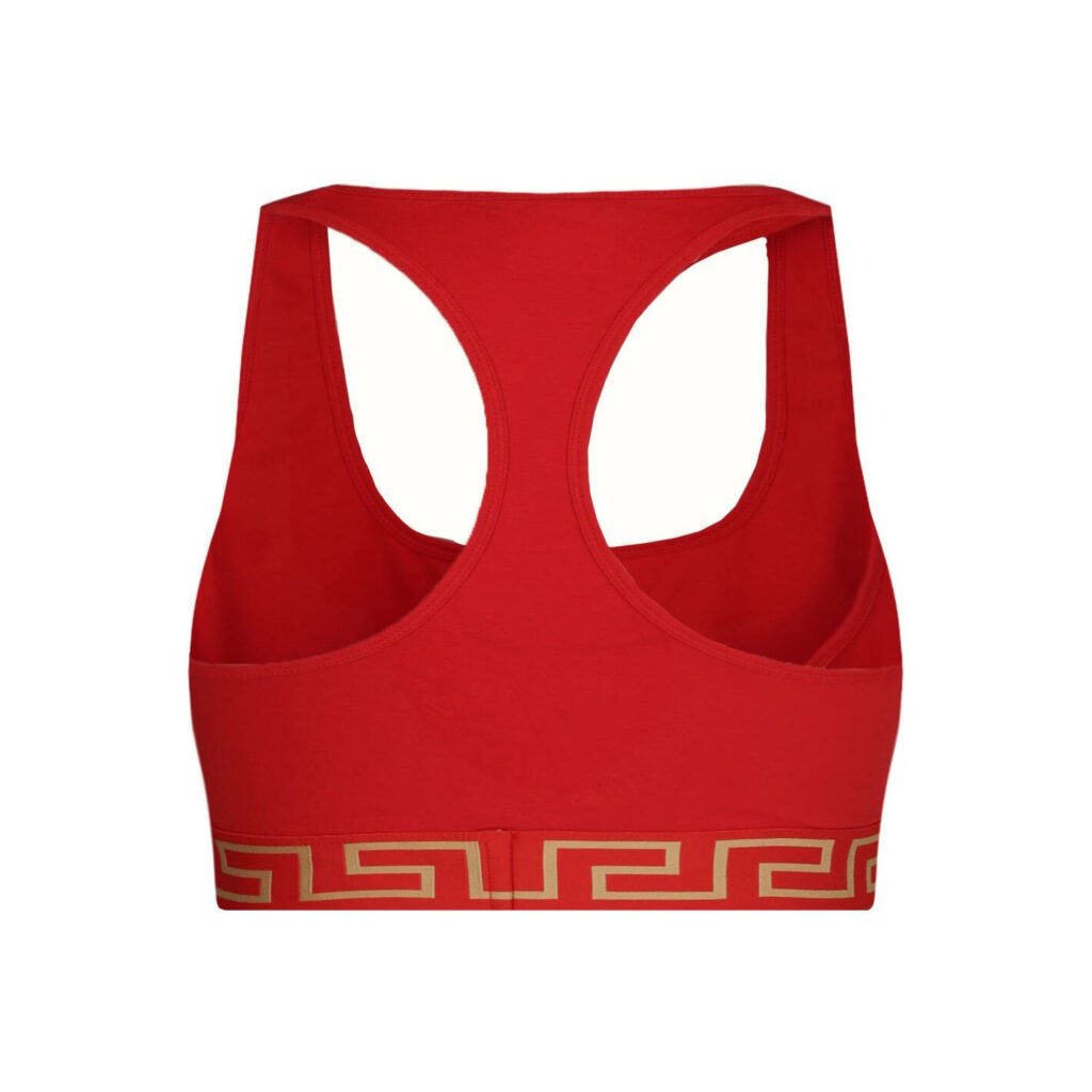 This sporty Versace bralette features a bold red hue and iconic branding, designed for both comfort and activewear flair.