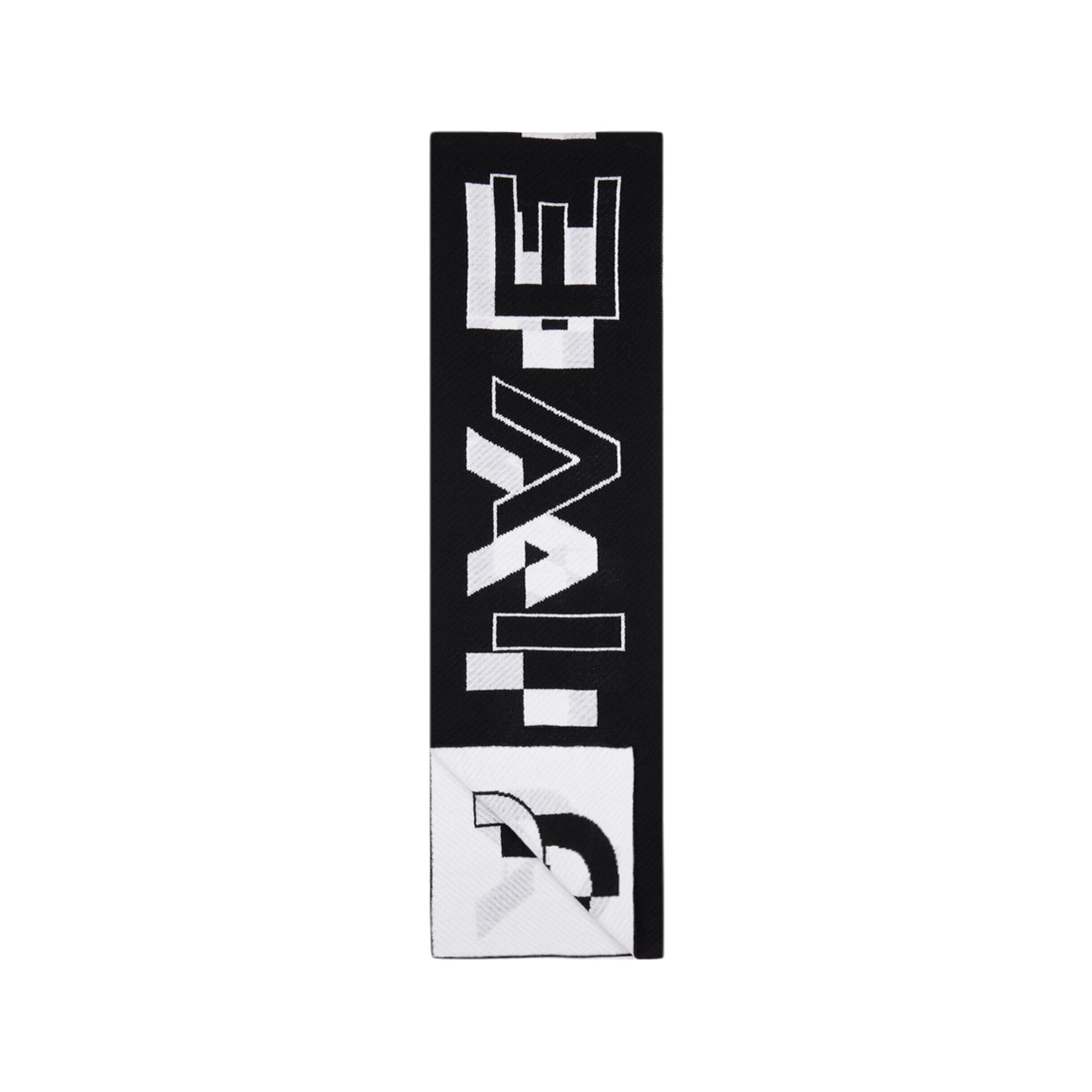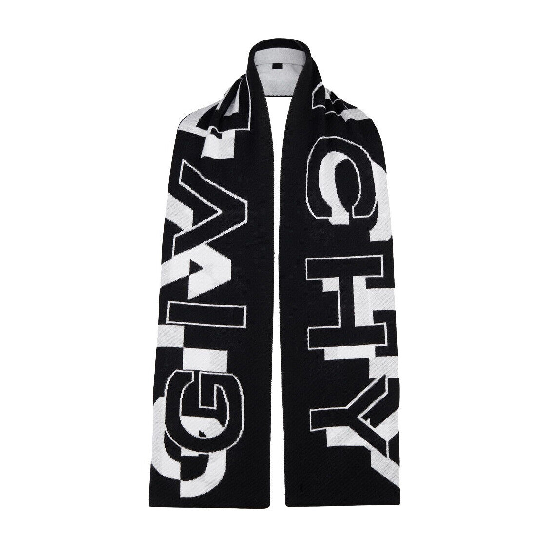 黑白羊毛足球围巾,背面饰有分割的 GIVENCHY 标志和反色效果。