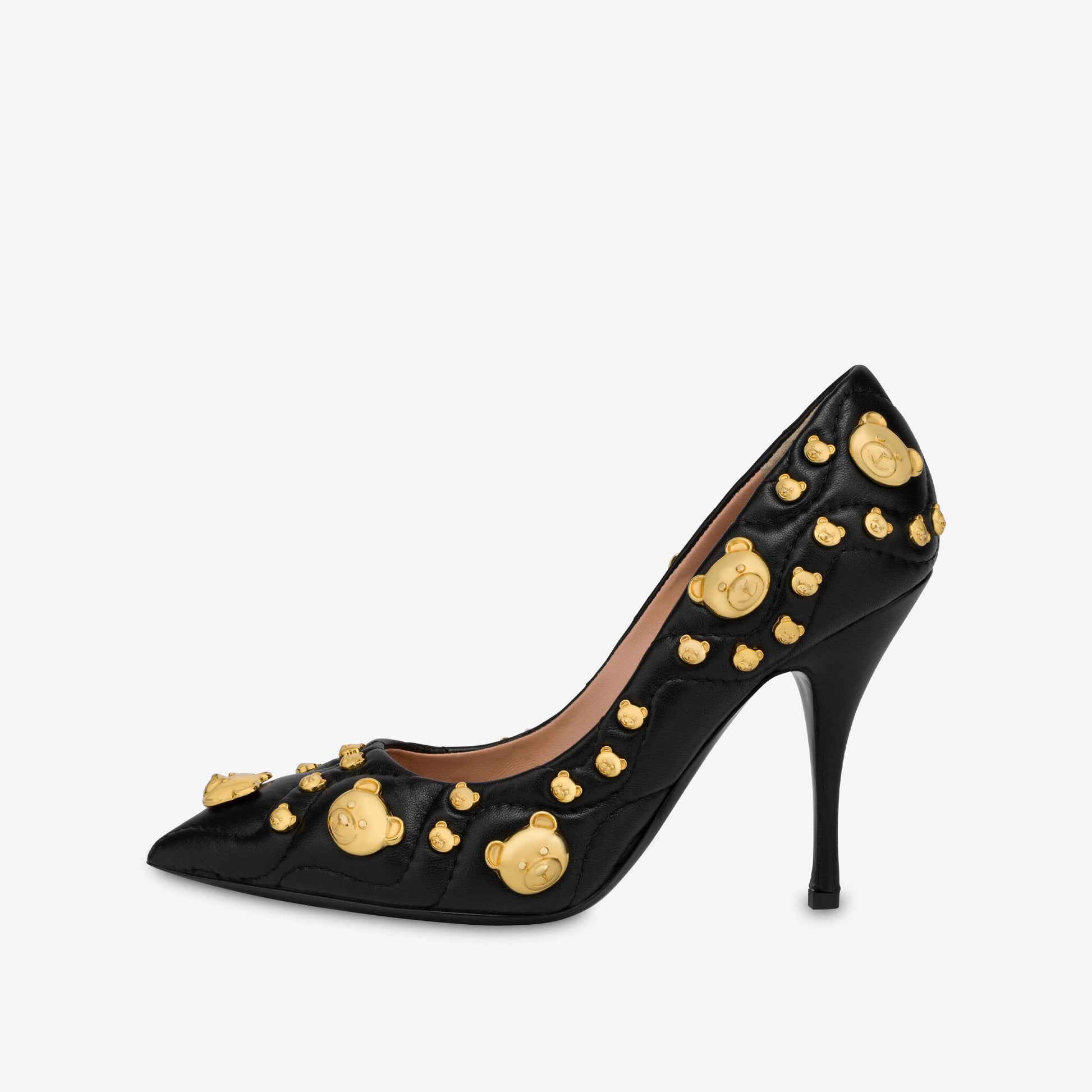 绗缝纳帕高跟鞋,全身饰有 Moschino 泰迪熊形状铆钉。