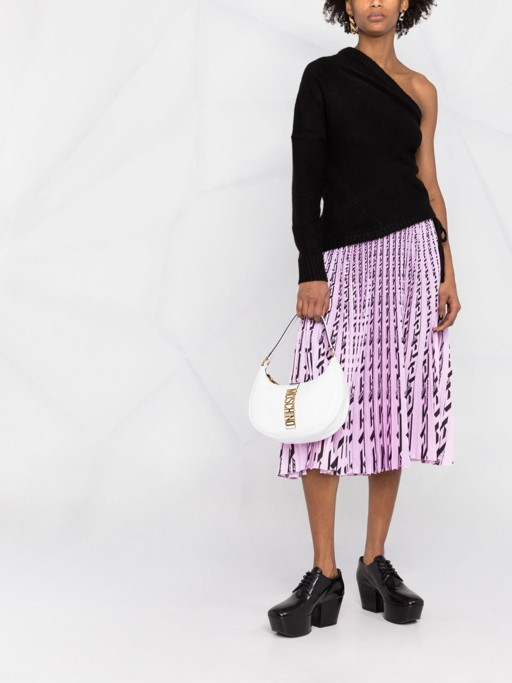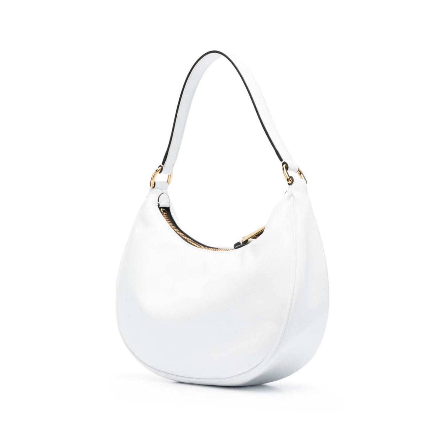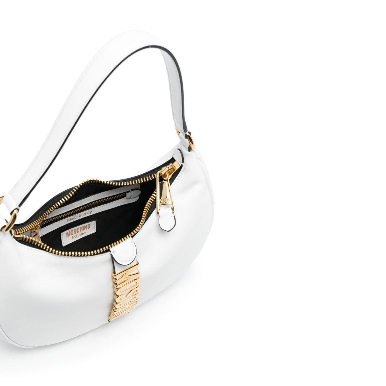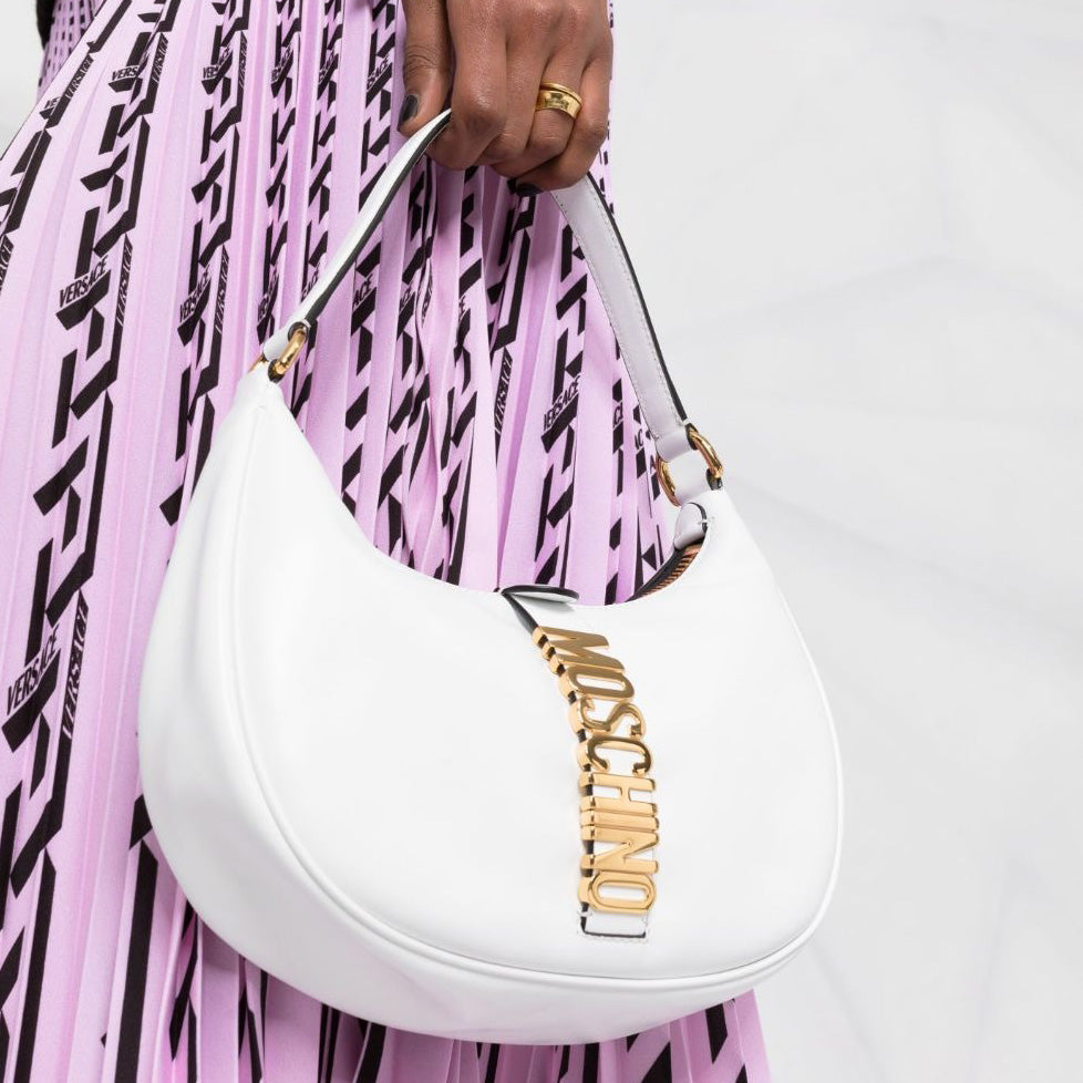 Moschino 擅长在经典廓形上增添大胆标志性细节。这款单肩包采用白色配色,正面饰有金色徽标牌,彰显其独特魅力。