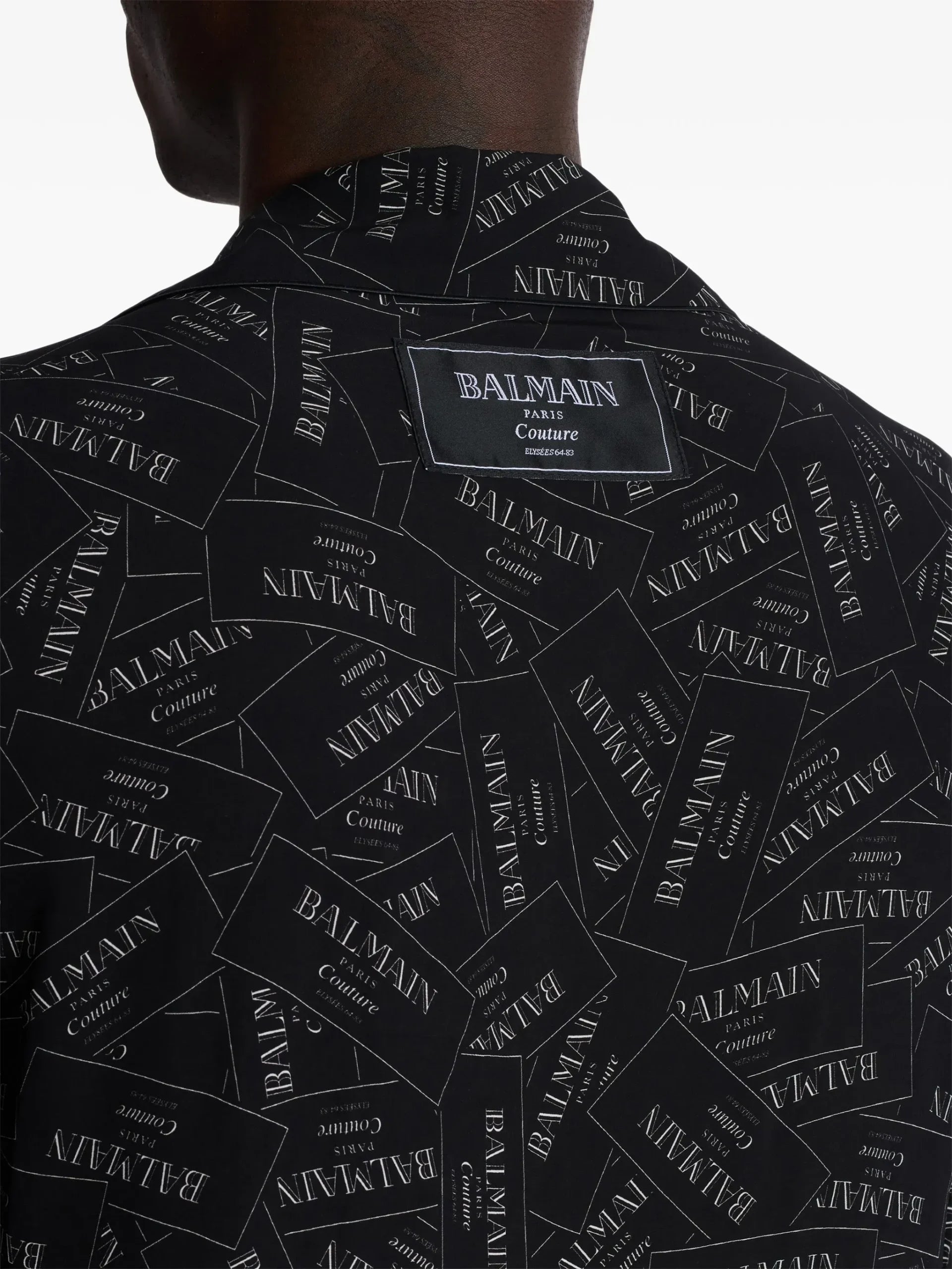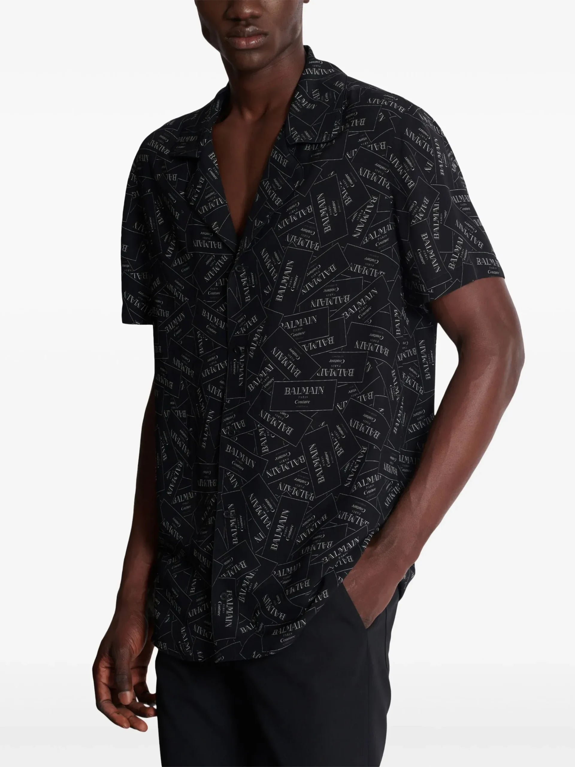 这款 Balmain 短袖衬衫是一款引人注目的单品,全身印有徽标,体现了现代精致和奢华感。