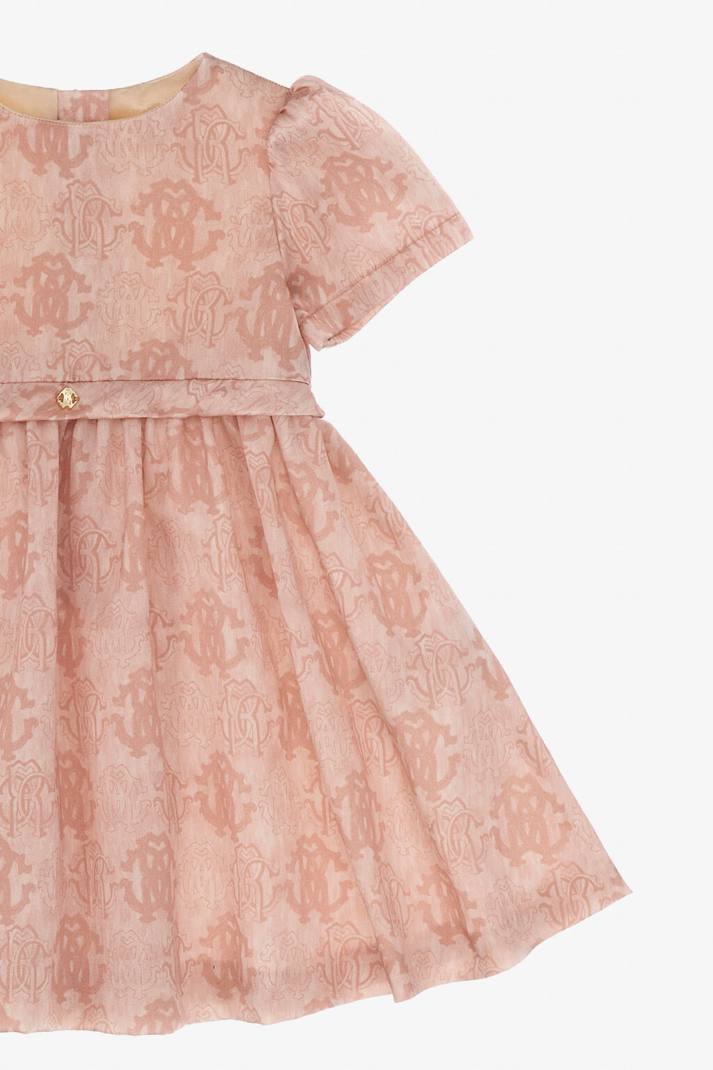 Roberto Cavalli 的 Logo RC 连衣裙,采用浅粉色设计,柔和优雅。面料上织有品牌标志性的 RC 字母图案。泡泡袖和收腰设计,搭配精致的纽扣,为特殊活动和庆典打造迷人而精致的造型。