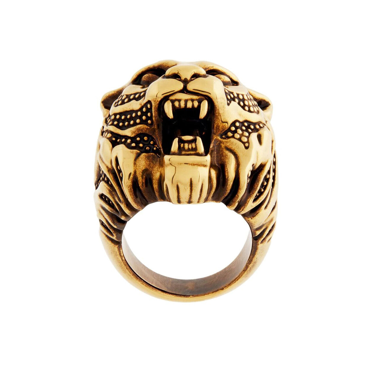 Roberto Cavalli 的珠宝大胆而真实地展现了其标志性的动物图案,这款咆哮虎头戒指便是其中的代表。戒指采用古金色锡镴铸造,厚重的设计与精雕细琢的抛光雕刻形成鲜明对比。