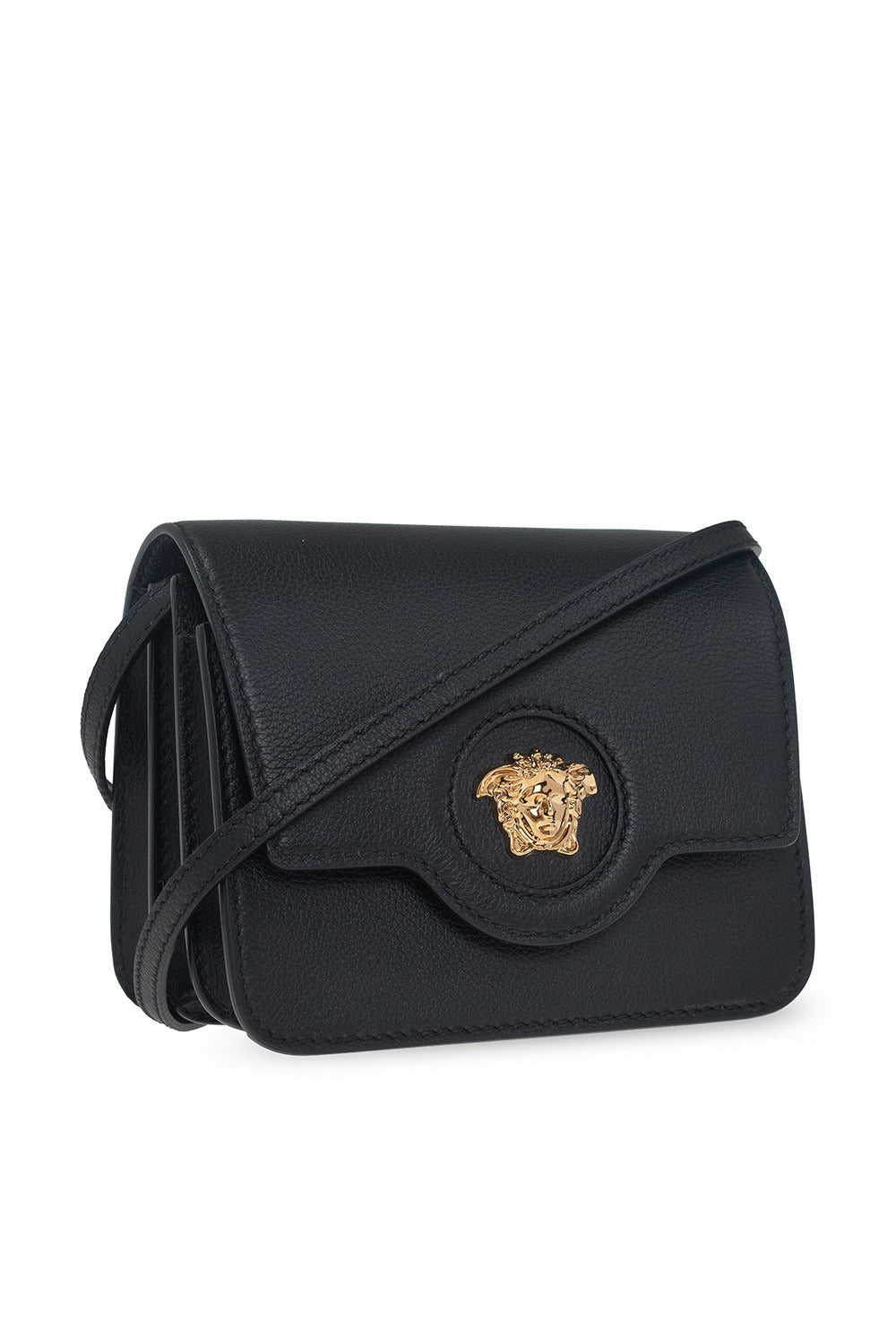 Versace 黑色“La Medusa”单肩包。采用小牛皮制成,磁扣固定,饰有标志性美杜莎图案,背面饰有金色标志,配有可拆卸可调节肩带和金色金属配件,内部设有两个隔层和一个拉链口袋。