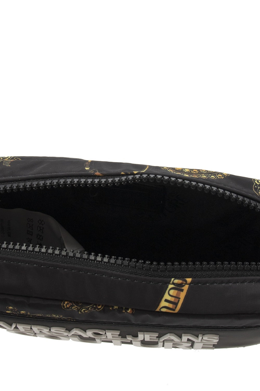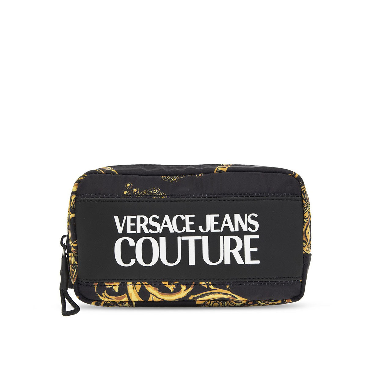 Versace Jeans Couture 黑色腰包。仿皮饰边,拉链开合,黄棕色巴洛克印花,正面白色凸起标志,背面印花贴片,可调节肩带,内部有一个隔层。
