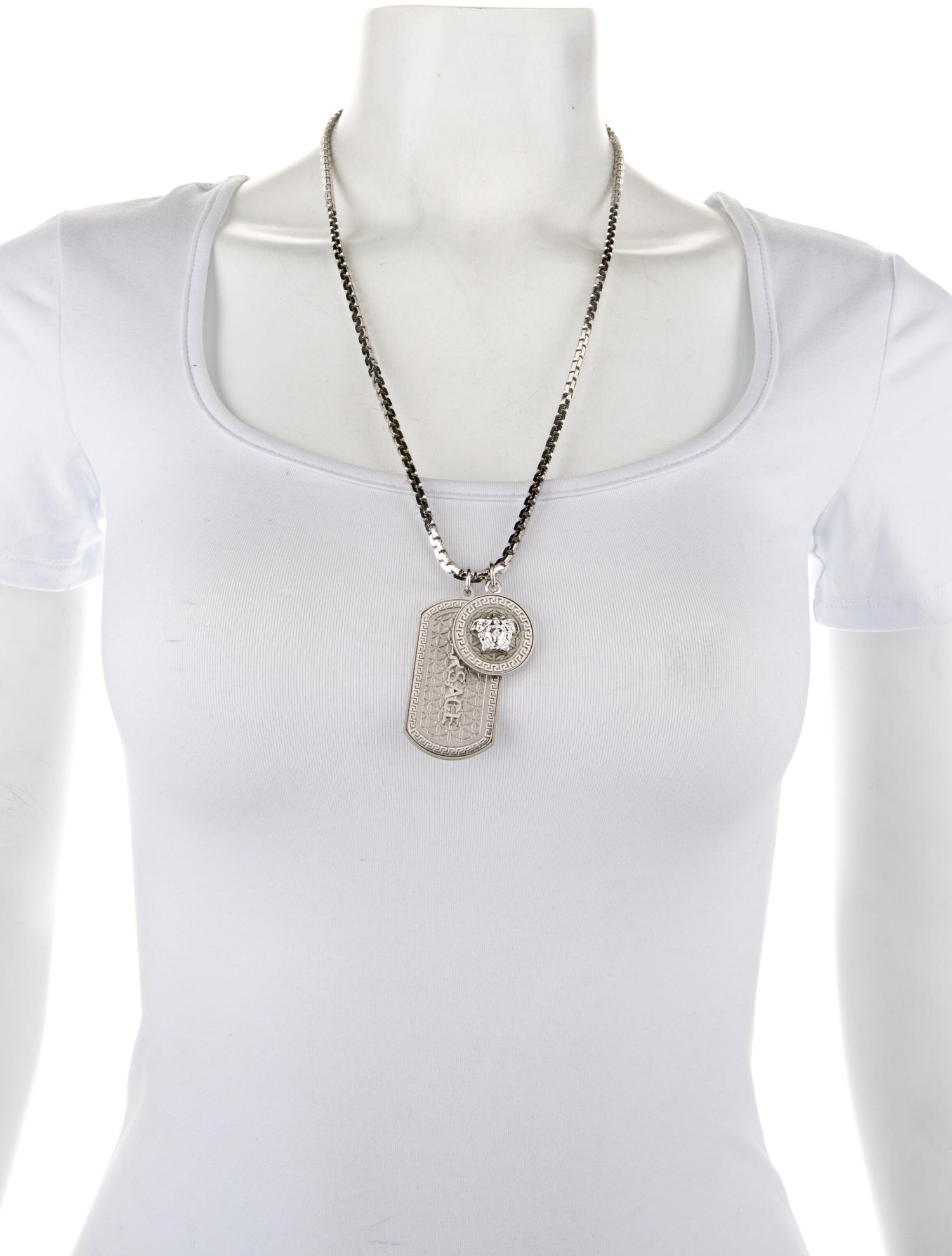 银色金属男装项链,配两个吊坠。所有范思哲珠宝产品均不含铅和镍。所有材质均为防过敏材质。
